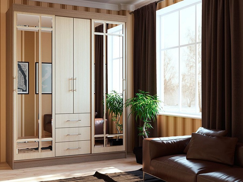 Лаконичный внешний вид и стильный дизайн четырехдверного шкафа-купе удачно сочетаются с практичностью и надежностью. Боковые зеркала зрительно уменьшают его объемные формы, придают ему некоторую хрупкость и невесомость.